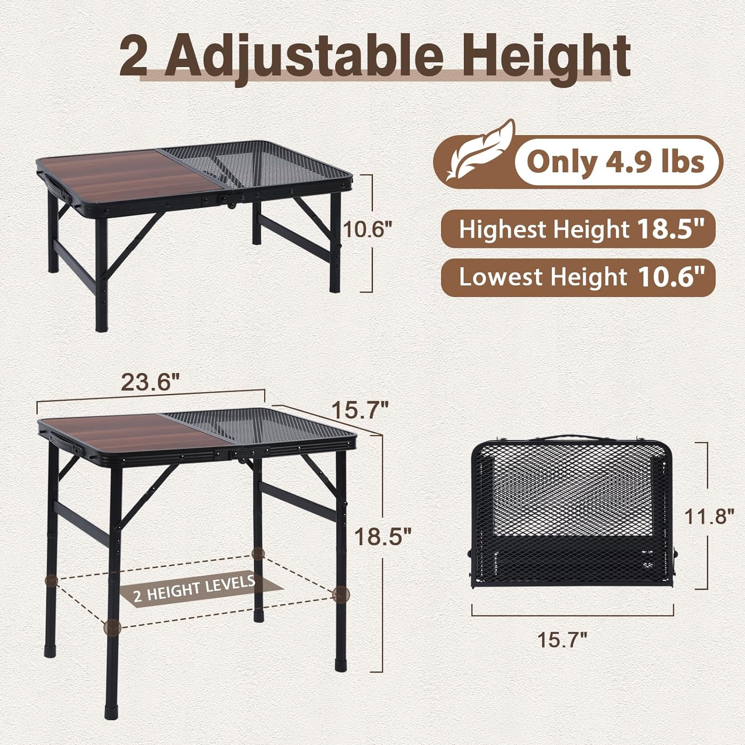 - 2 Adjustable Height: From the initial height of 10.6 inches, to just connect the tube feet can immediately have a height of 18.5 inches, JOUYEK folding grill tables provide the comfort for both standing and sitting.