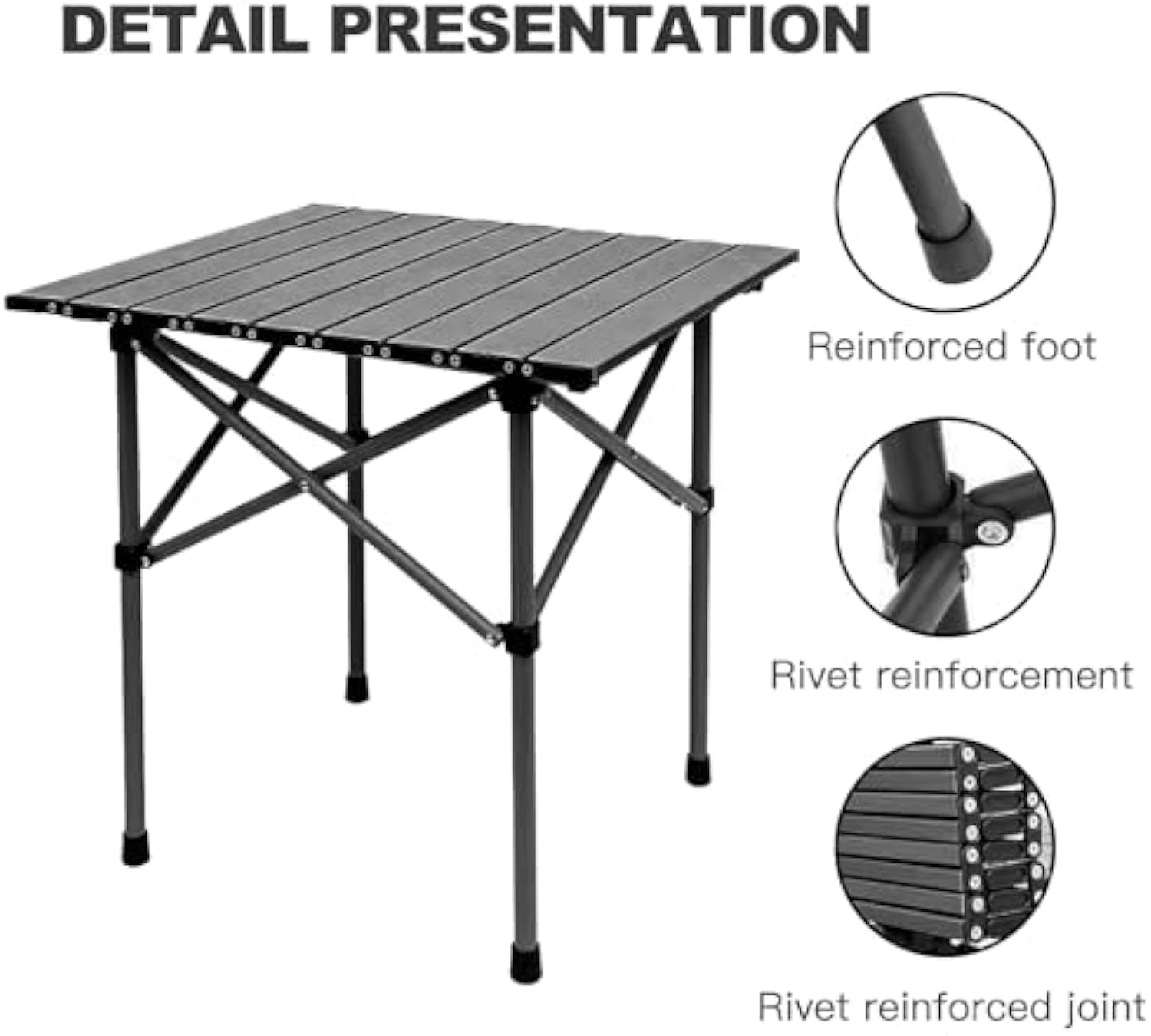 - [Stable & Durable]-This portable camp table adopts metal material contact point and triangular steel structure design to ensure stable use.The reinforced table legs are not easy to bend and deformation.The aluminum frame and table top connection is compact, solid design can sustain maximum 55 pounds.