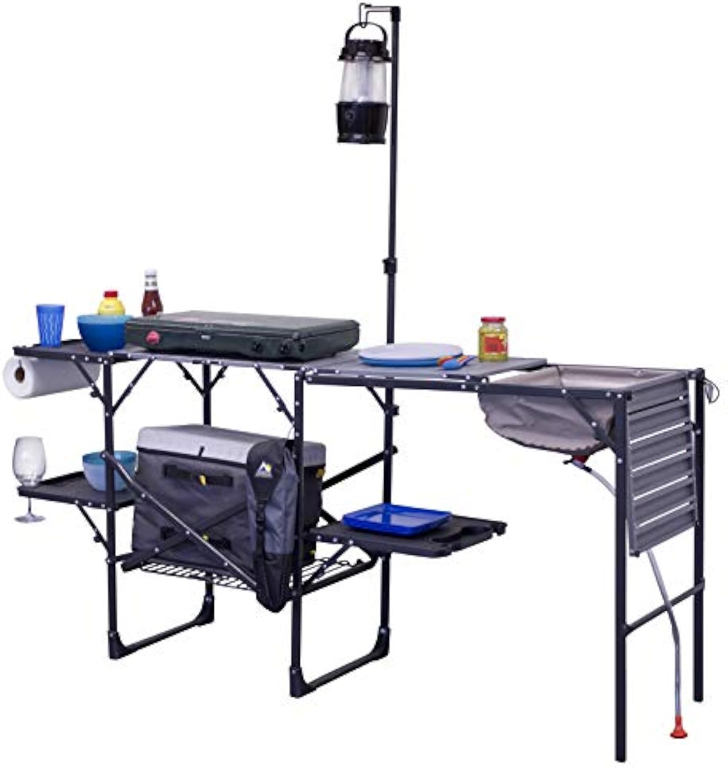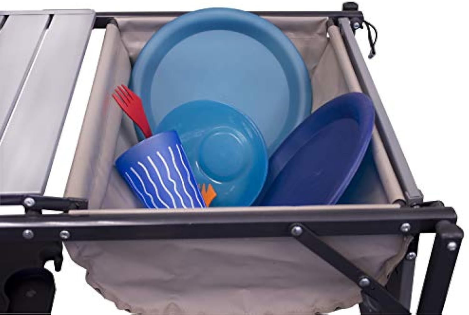 - ALL-IN-ONE STATION. All the comforts of home wherever you go, such as 3 durable side tables, soft-shell sink, storage rack, and an easy grab paper towel holder. Attach a lantern to the telescoping pole for visibility after sunset and keep the party going.