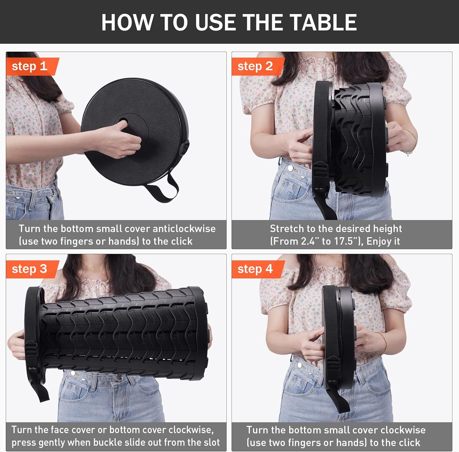 - [EASY TO SET UP]: Note: Please open the folding table lightly. You just need to lift the tab a little to open it. It may be broken if you open the tab too hard, then unfold the table leg and fasten the triangle bar, insert two side bars and fix the table, stretch the table up to the desired height, finally hang the storage net on the hook under the table. You can even assemble this in one minute! It is so easy that a kid can do it!