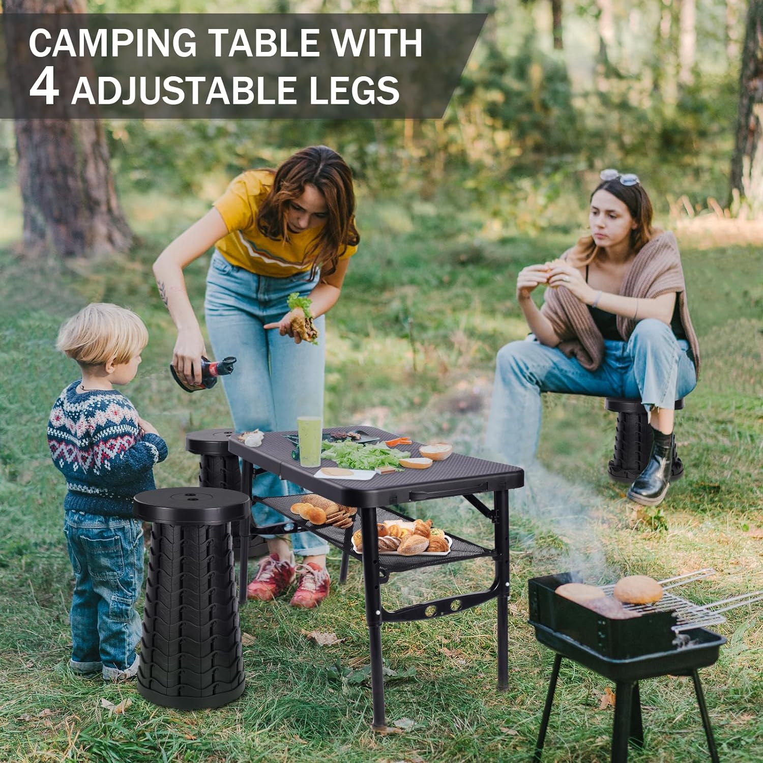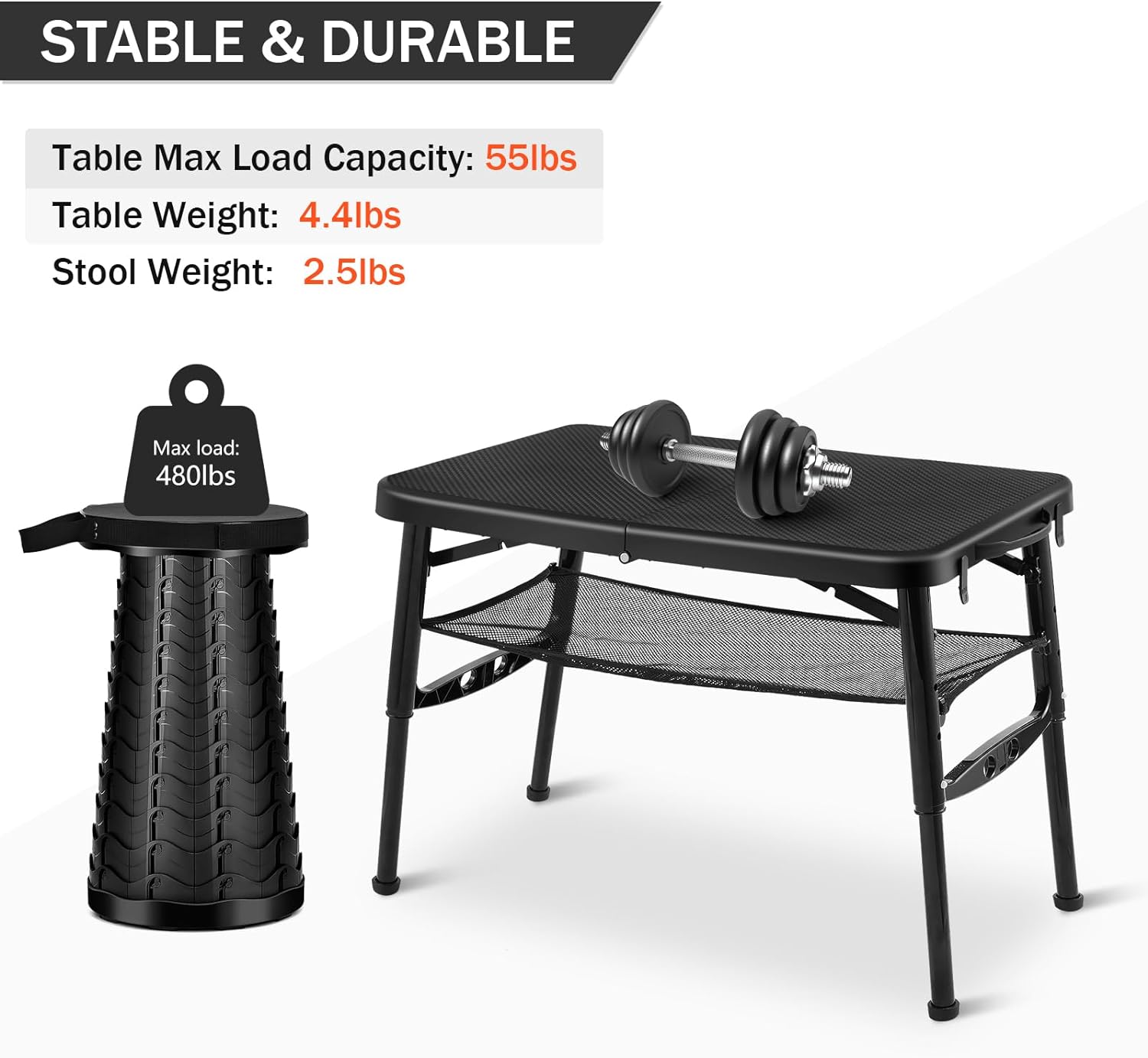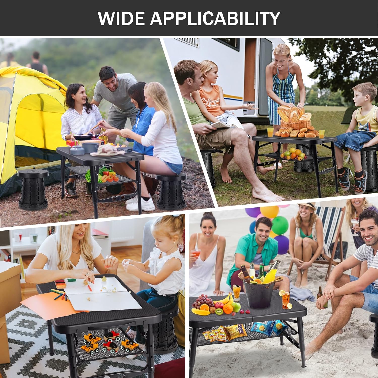 - [ADJUSTABLE HEIGHTS]: 4 Adjustable heights for all occasions. Folding card table is designed with 4 telescoping ABS plastic legs, that can be adjusted to various heights 11.5", 15.7", 17.7", and 19.7", the stool height within the range of 2.4“ to 17.5”, 12 positions can be chosen, adapt to various grounds and meet your personal needs. you can change the height to use it for sitting or standing, The large surface for the table is 25.8''L x 17.5''W, providing plenty of utilization space.
